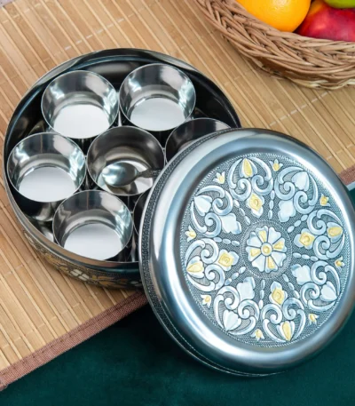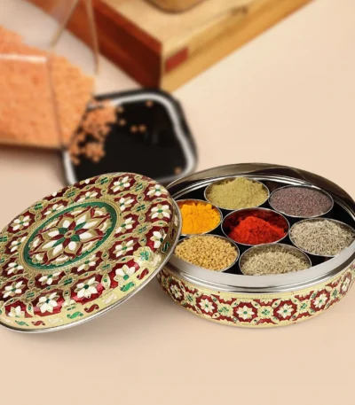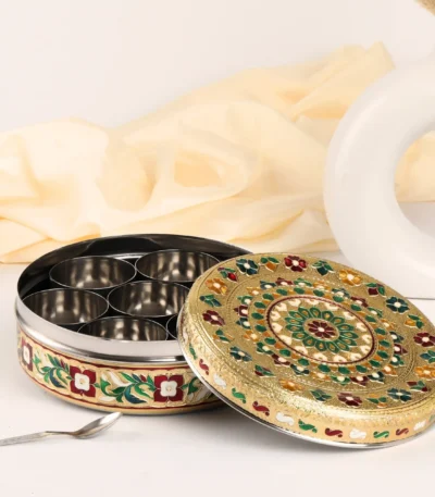 Stainless Steel Masala Box | Meenakari Container with 7 Bowls & Spoon