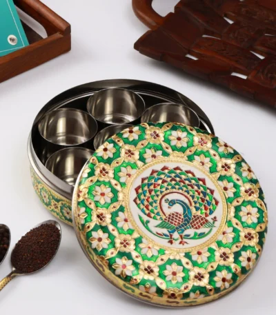 Spice Container Masala Storage Box Green Peacock Design | Kitchen Organizer
