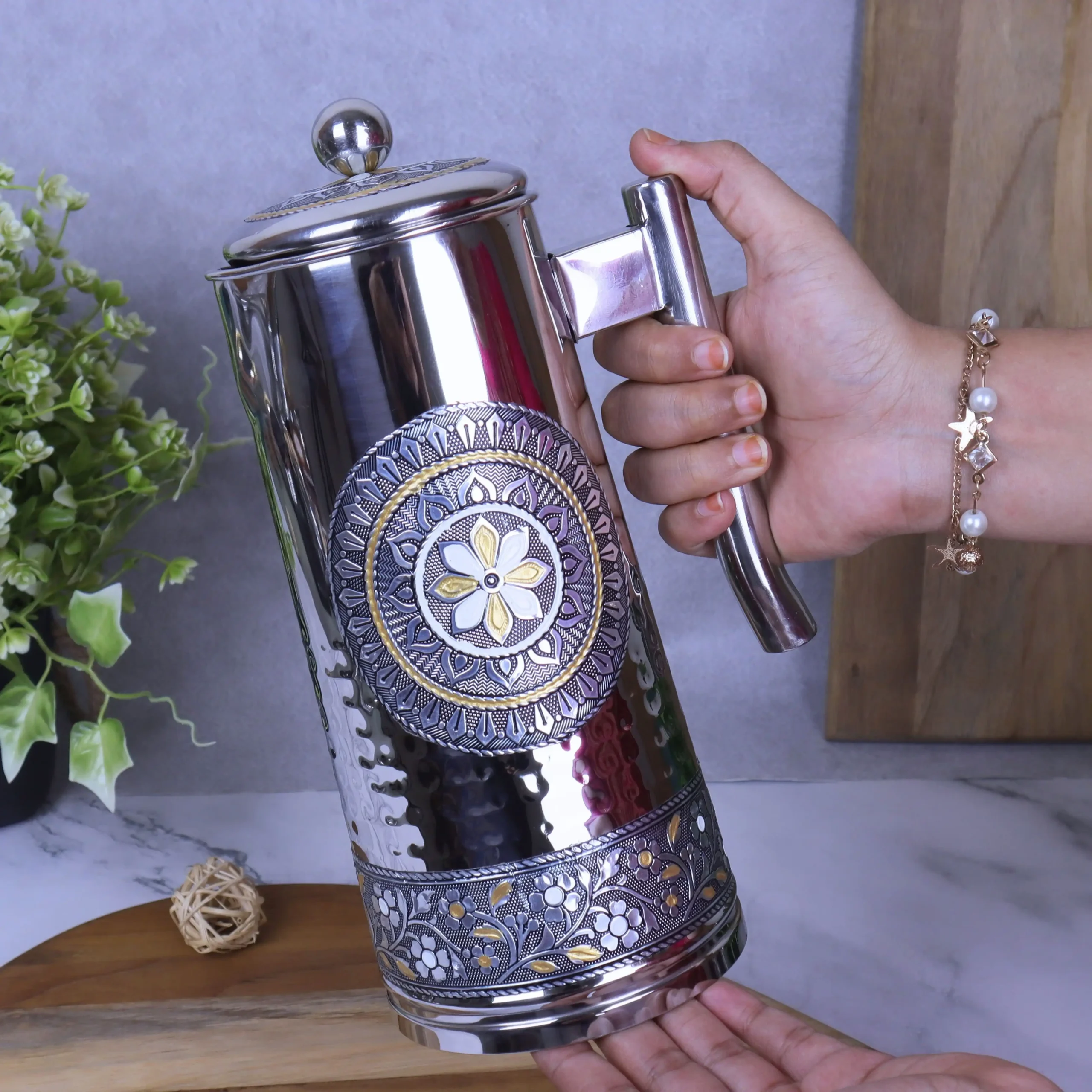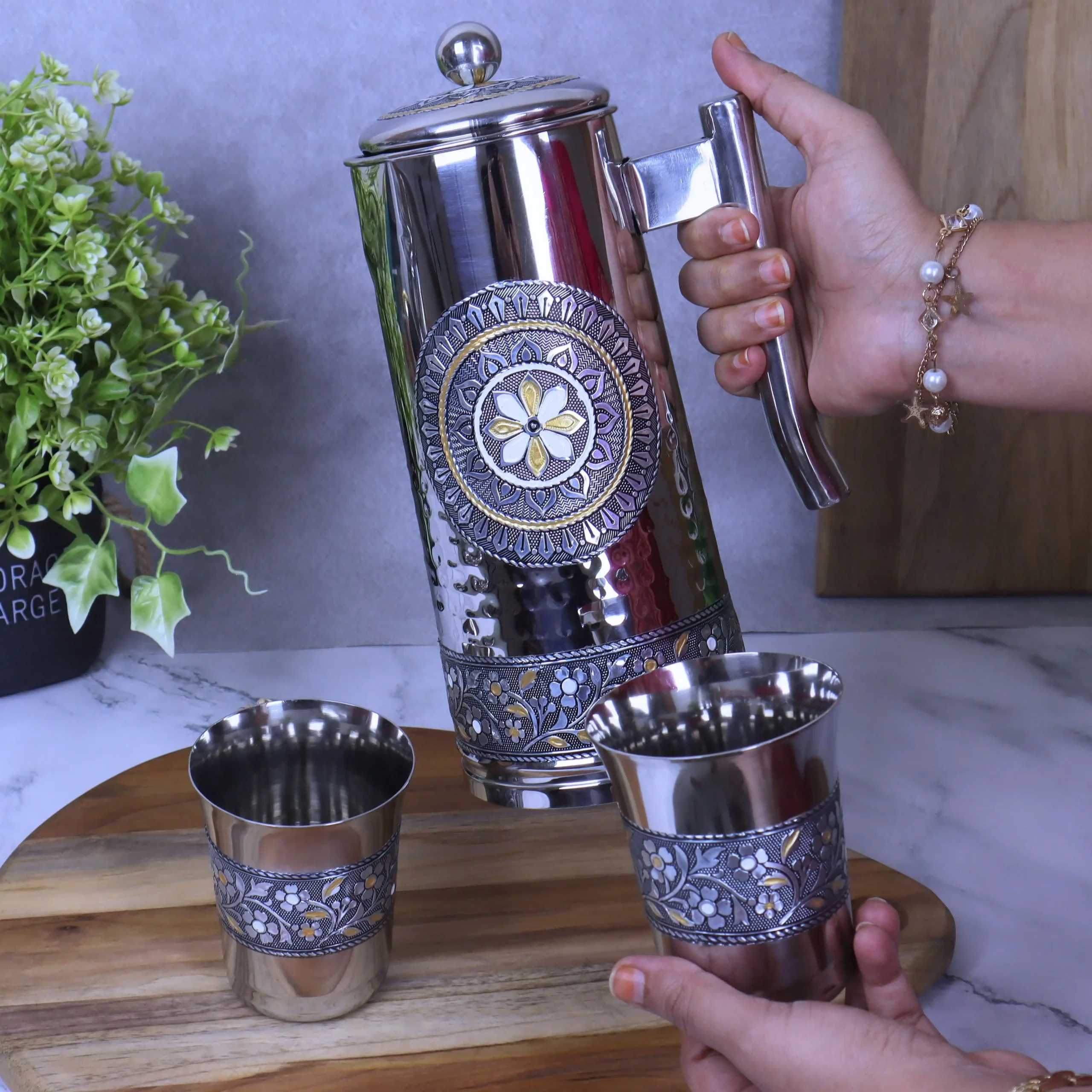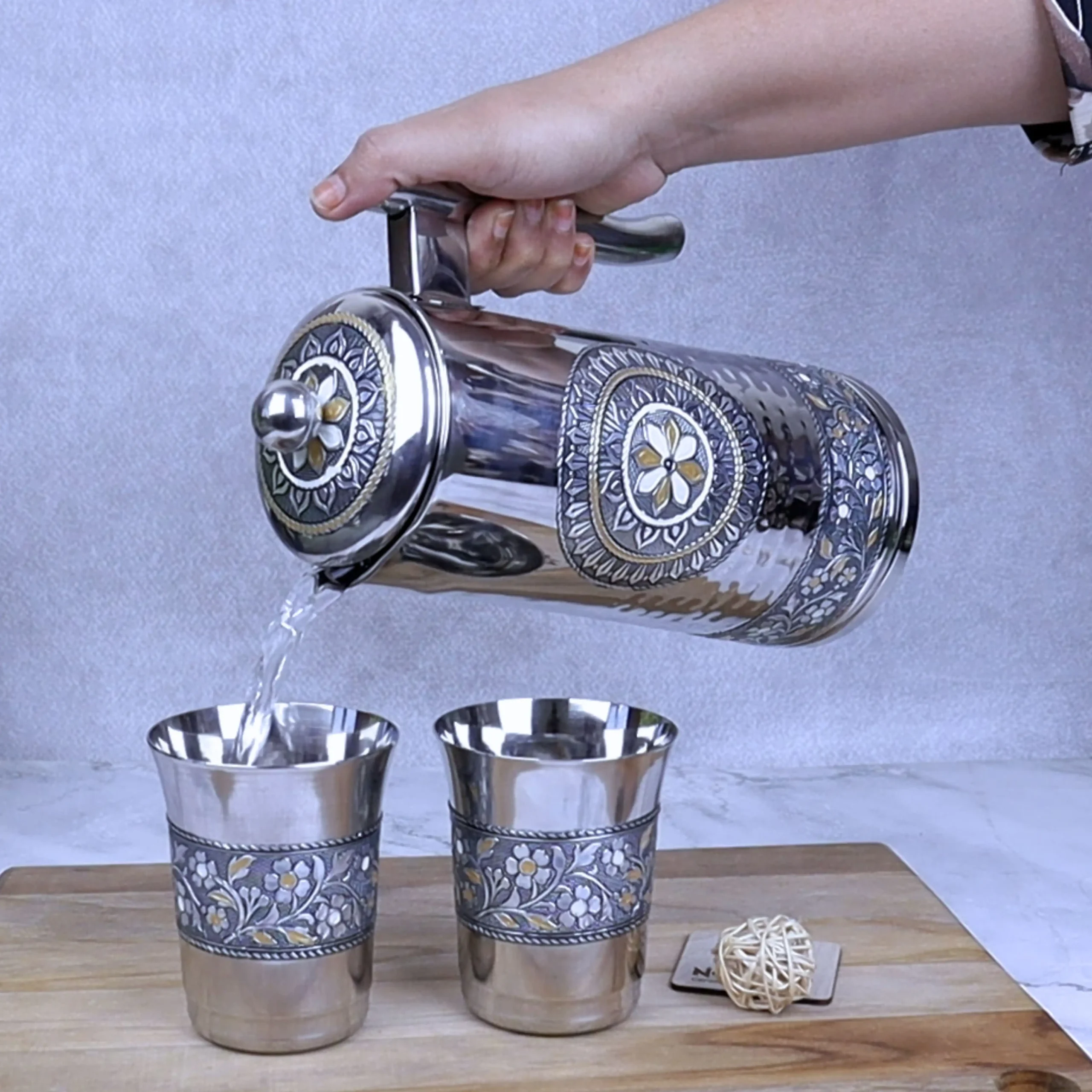 If you are looking for a durable, hygienic, and traditionally styled stainless steel jug and glass set for home use or gifting, this silver Meenakari jug set is an excellent choice. Order now and upgrade your drink serving setup.