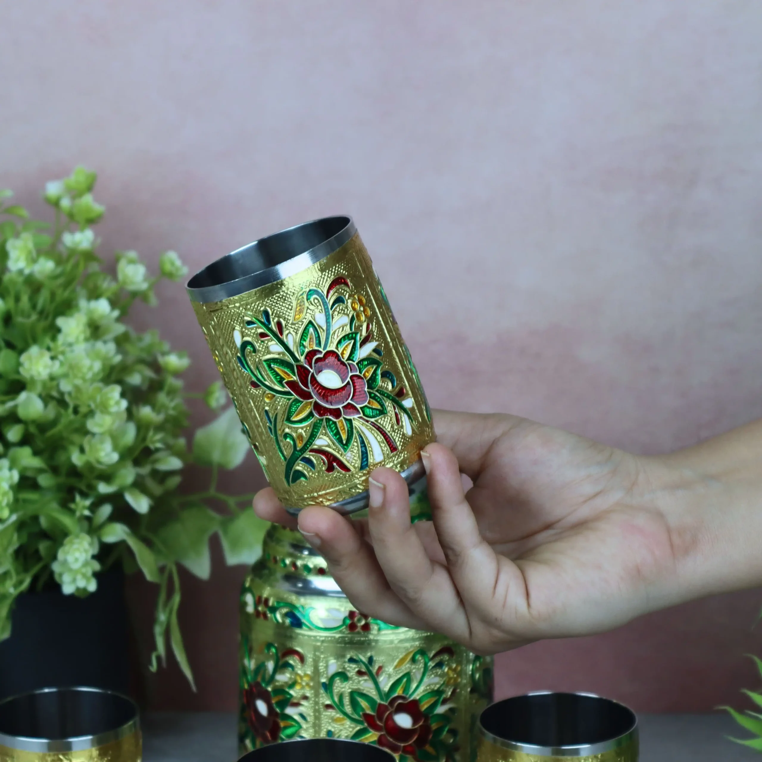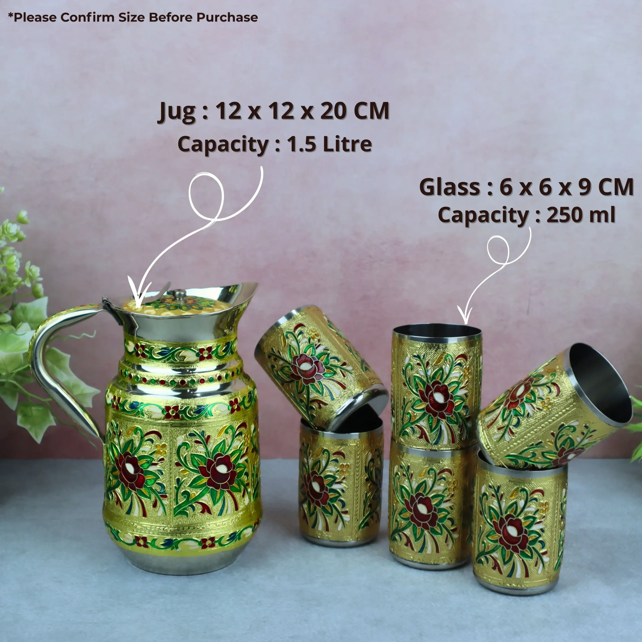 If you are looking for a durable, hygienic, and decorative stainless steel jug and glass set for home or gifting, this flower Meenakari jug set is an excellent choice. Order now and enhance your drink serving setup.