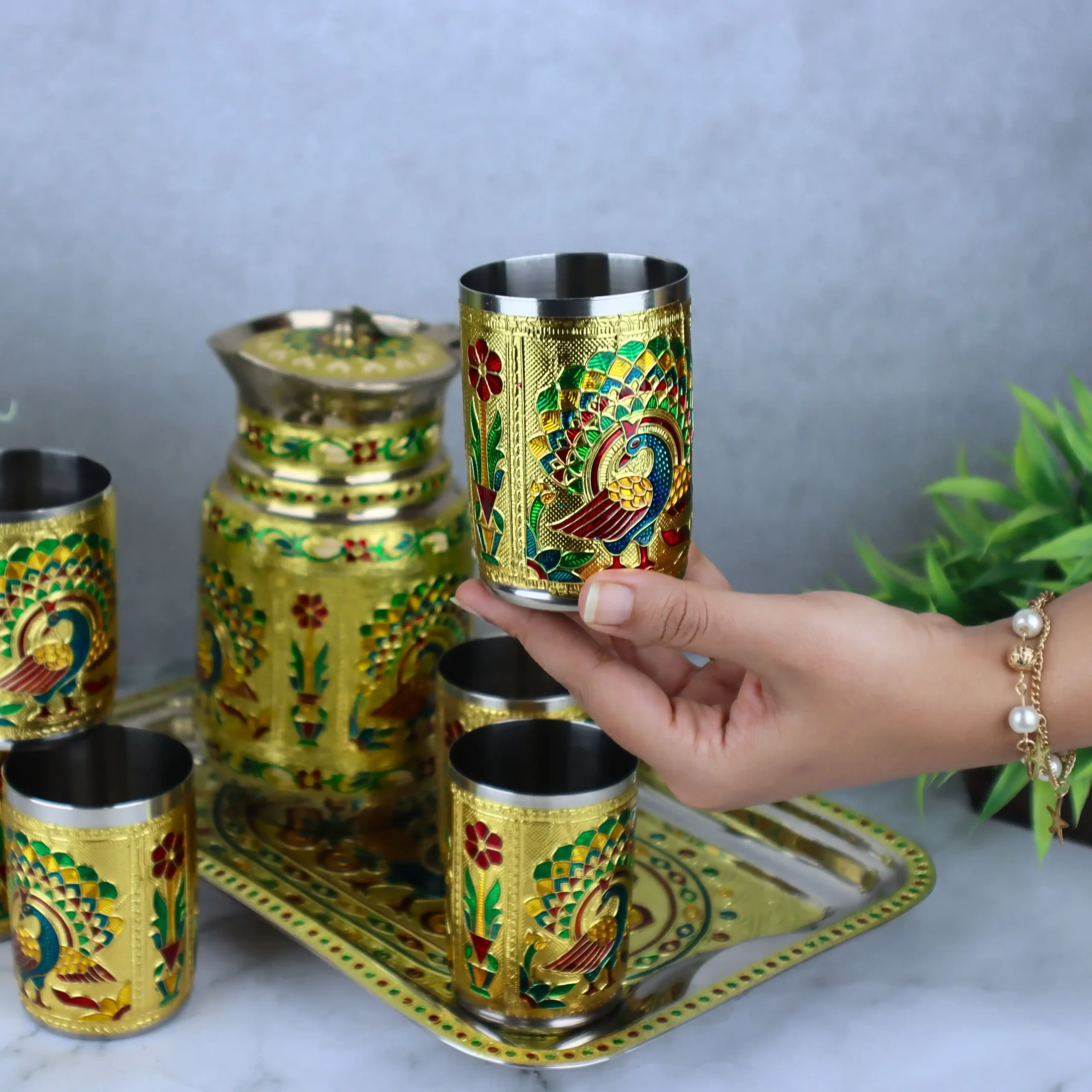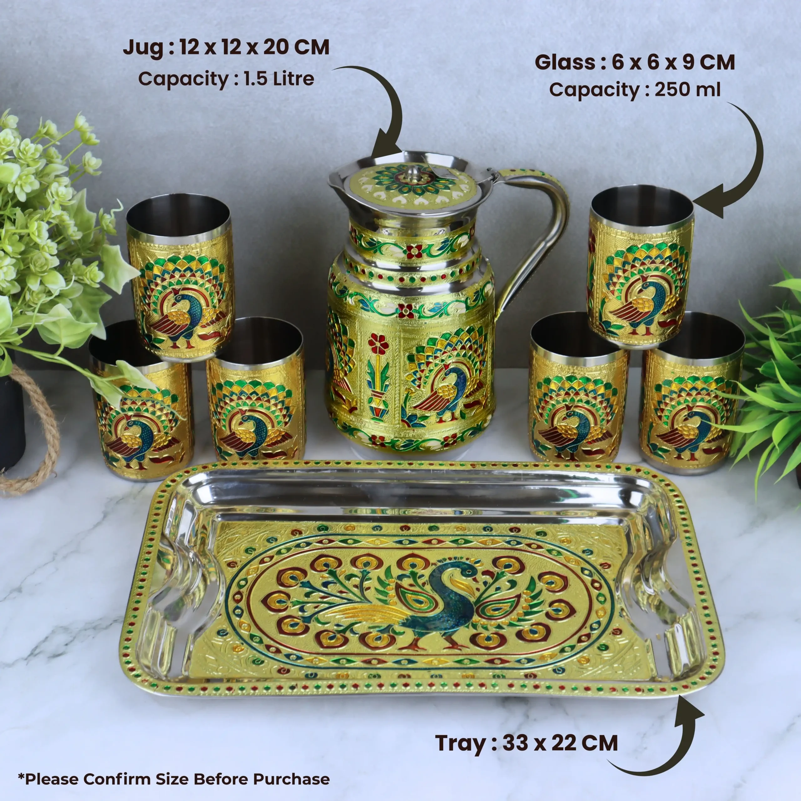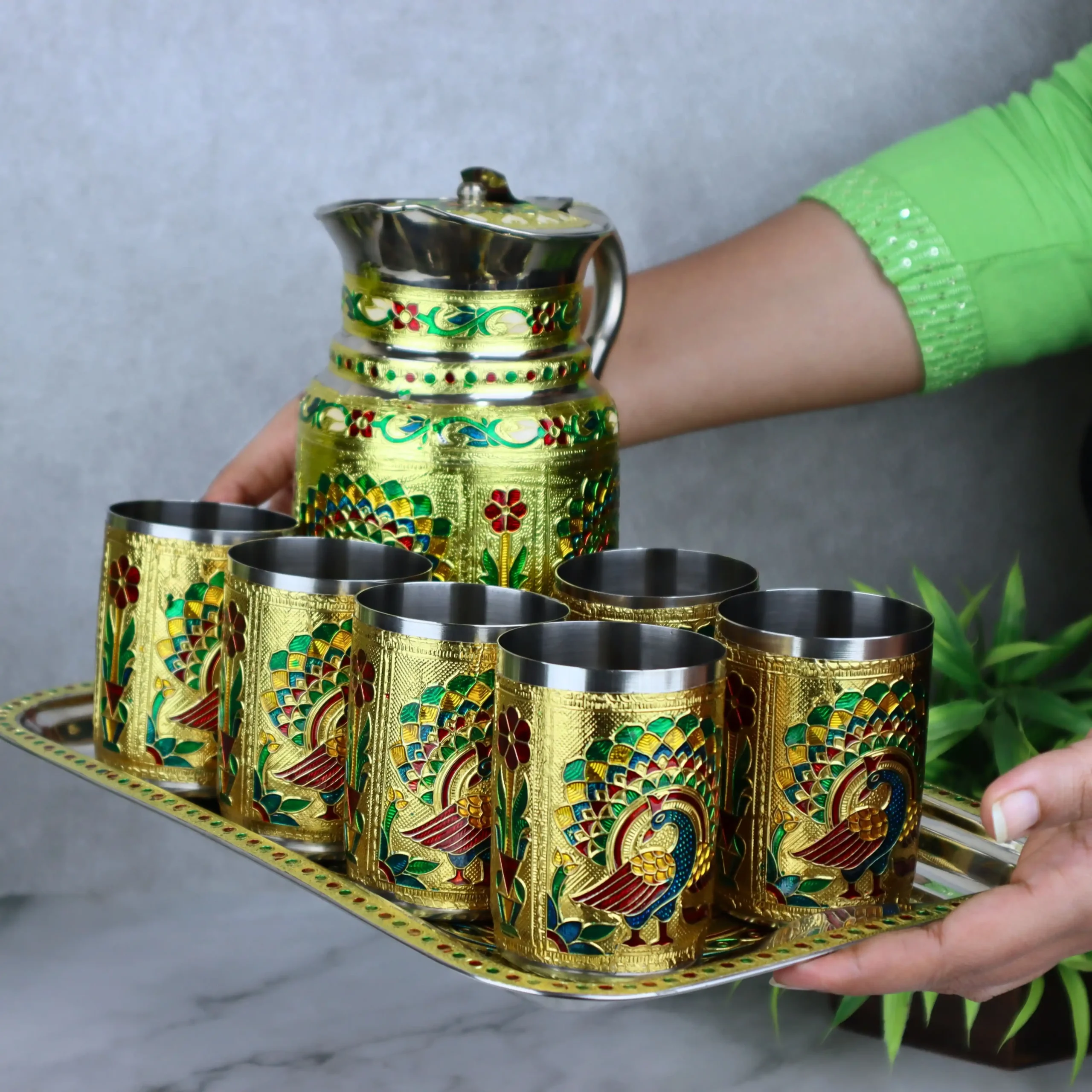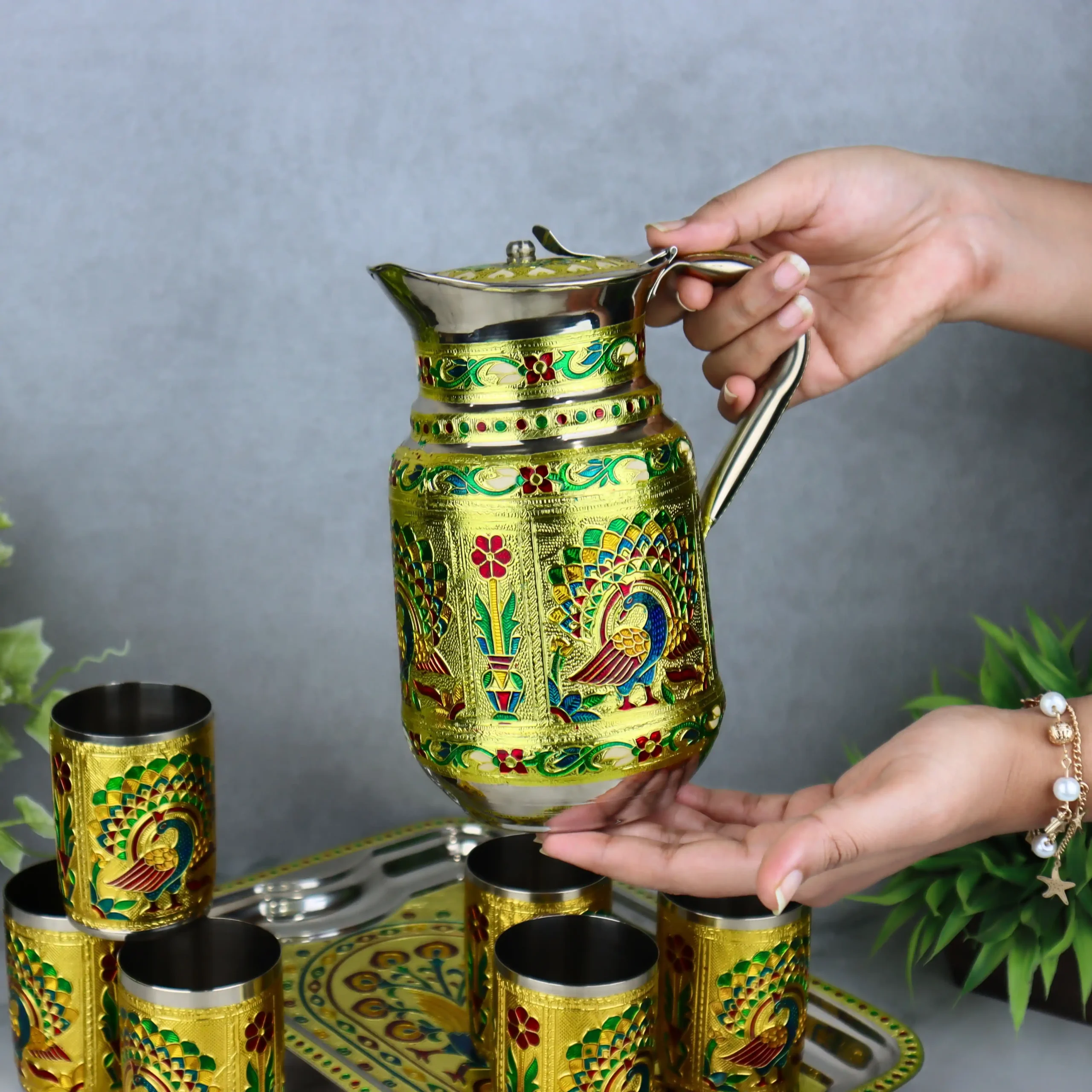 Lemon Set | Flower Meenakari Glass Jug Set with Serving Tray | Stainless Steel Water Jug with 6 Glasses