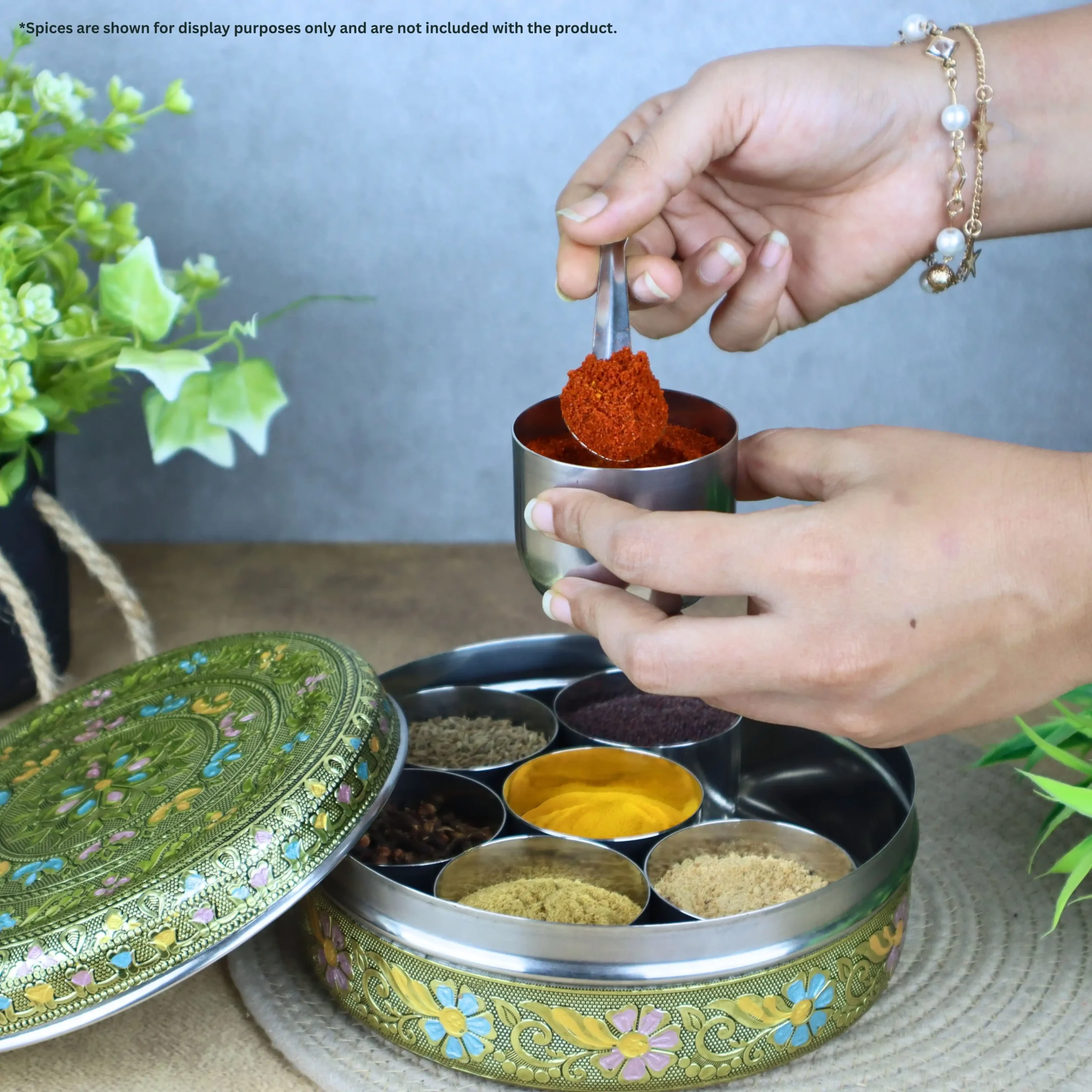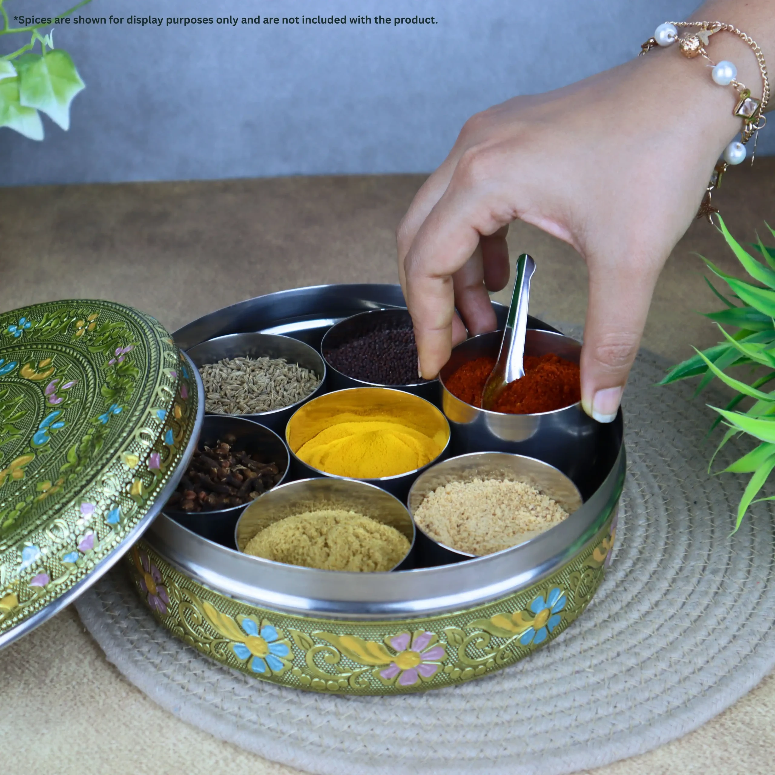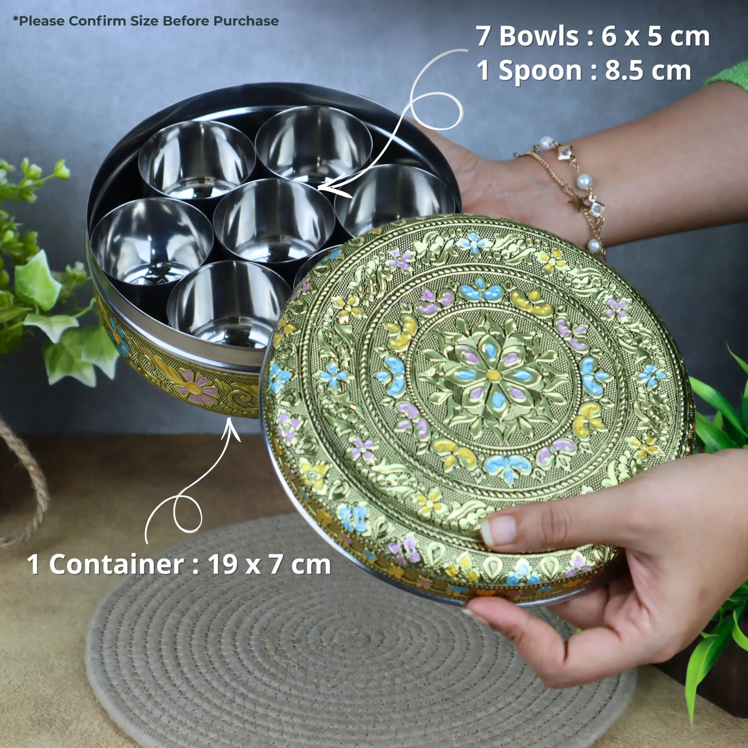 Spice Box Stainless Steel Masala Box | Golden Meenakari Container with 7 Bowls & Spoon
