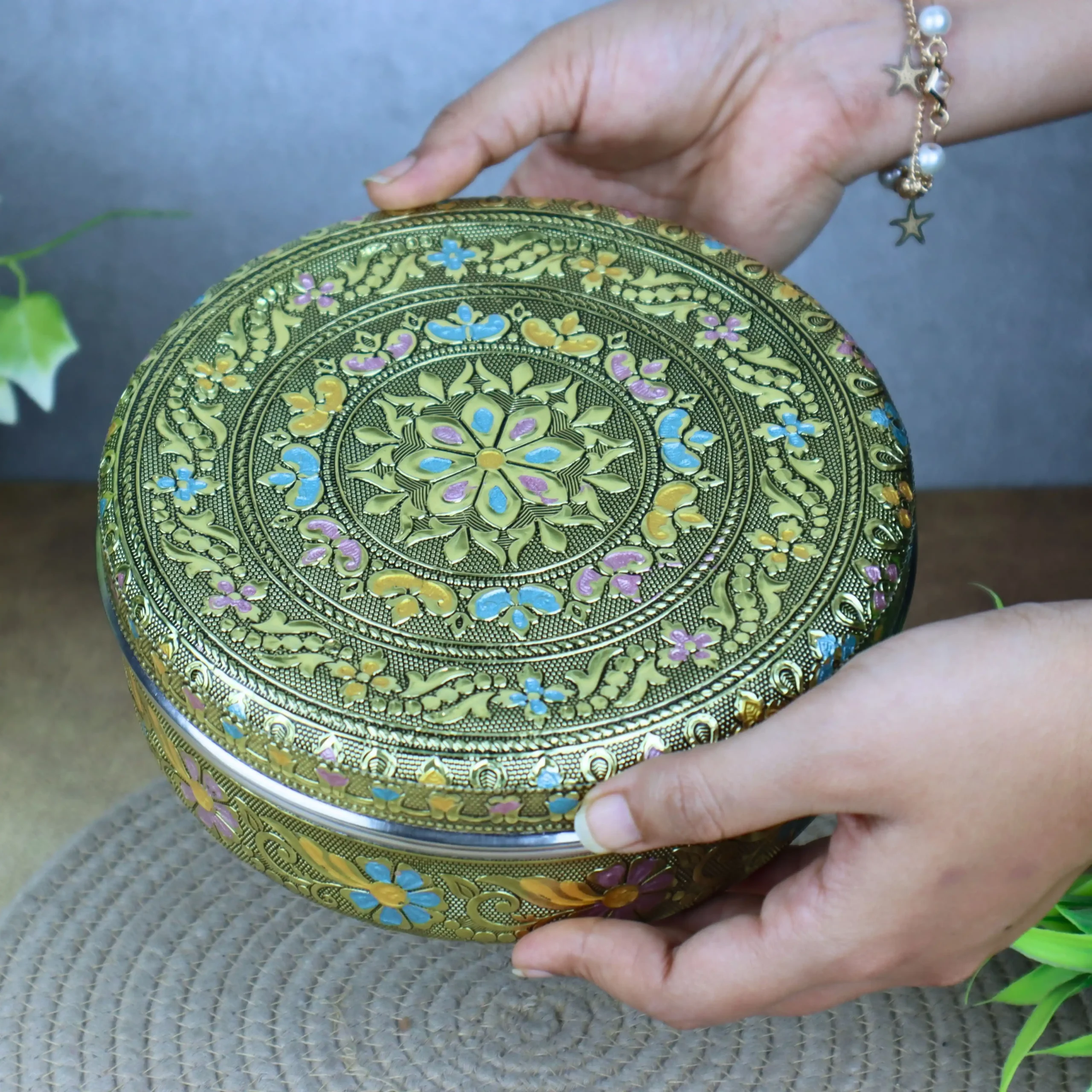 If you are looking for a hygienic, durable, and well-organized spice container for your kitchen, this golden Meenakari stainless steel masala box is an excellent choice. Order now and simplify your cooking routine.