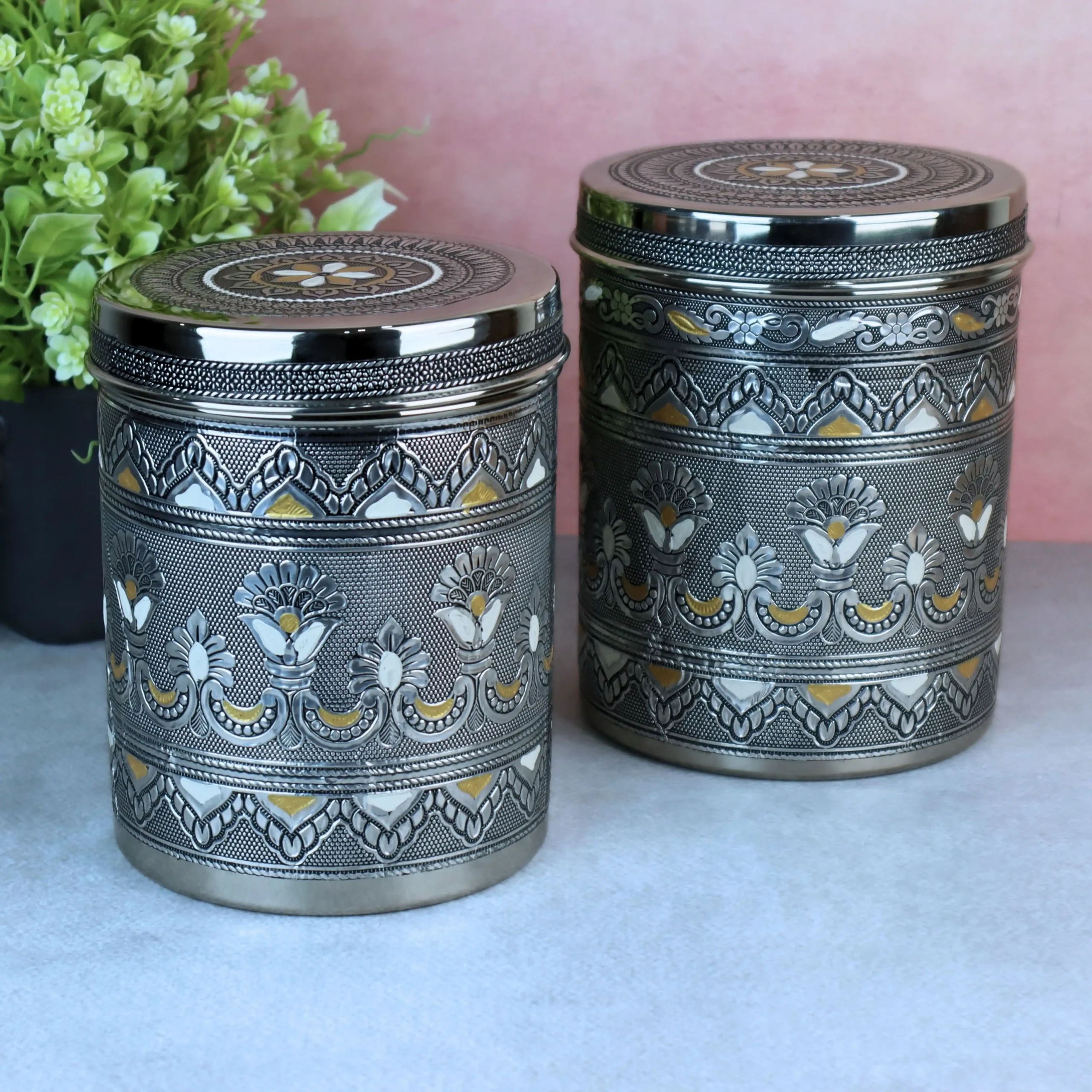 Stainless Steel Deep Dabba Kitchen Storage Containers | Antique Embossed Silver Oxidized Finish | Multipurpose Large Storage Boxes (Set of 2)