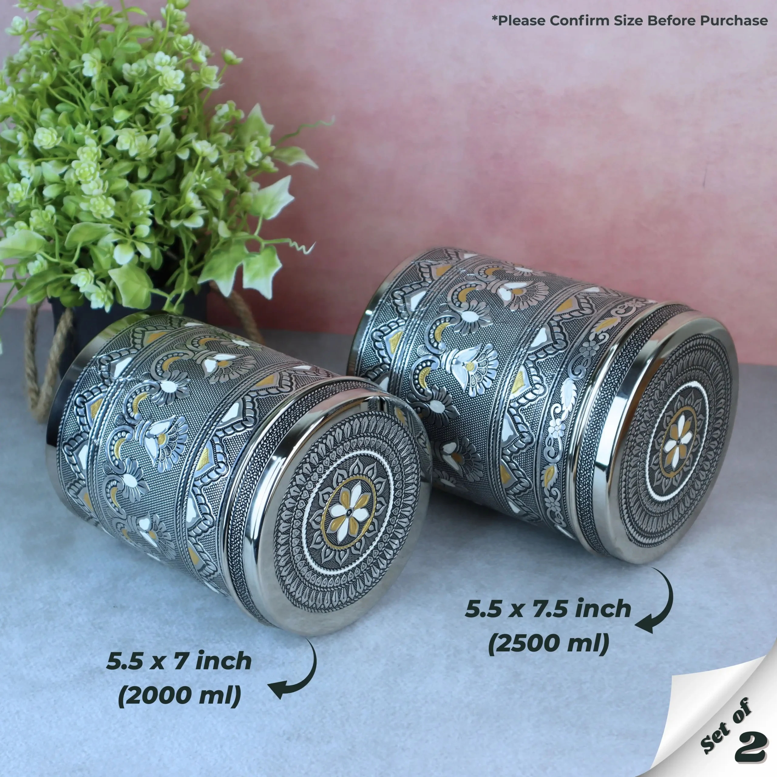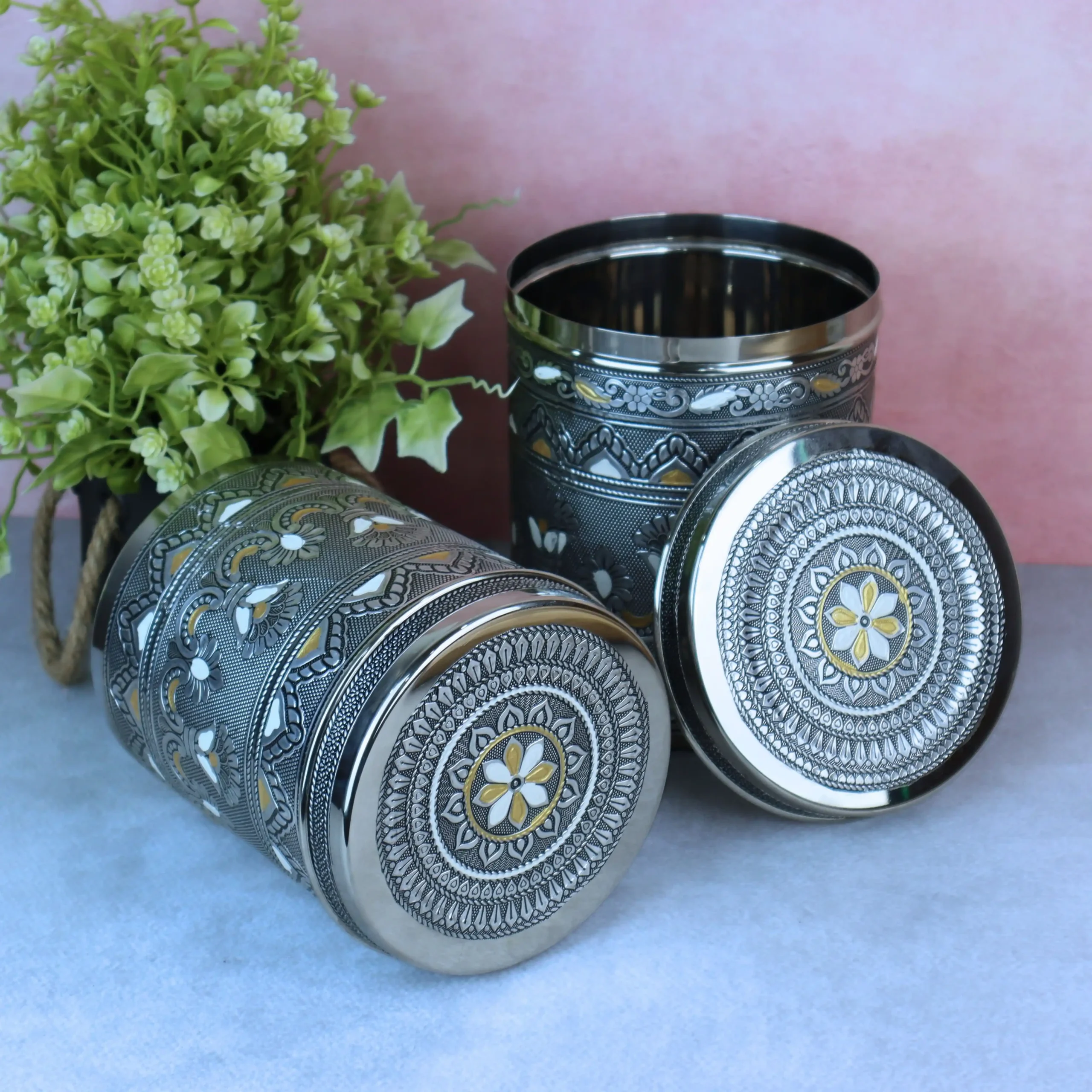 The Large Oxidized Steel Dabba set of 2 is designed for kitchens that need higher storage capacity for everyday essentials. Because large containers are ideal for bulk items, this stainless steel dabba set works well for storing dry foods and frequently used kitchen supplies. Additionally, the antique embossed silver oxidized finish adds traditional character, making the containers suitable for both cabinet storage and visible placement.