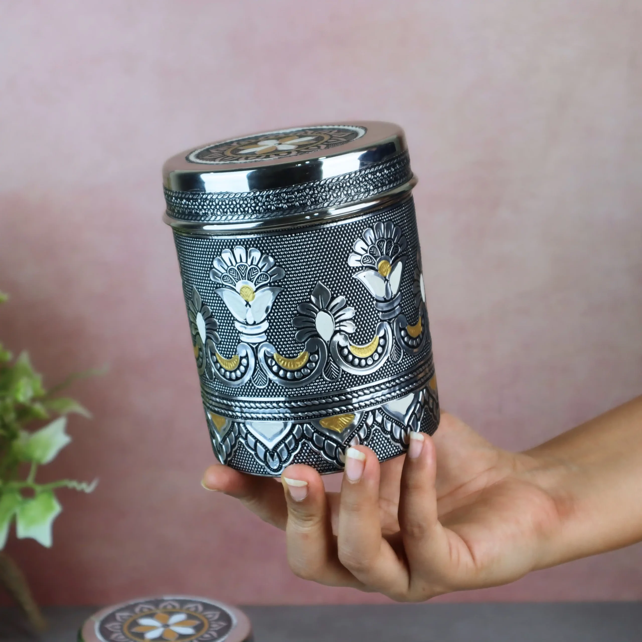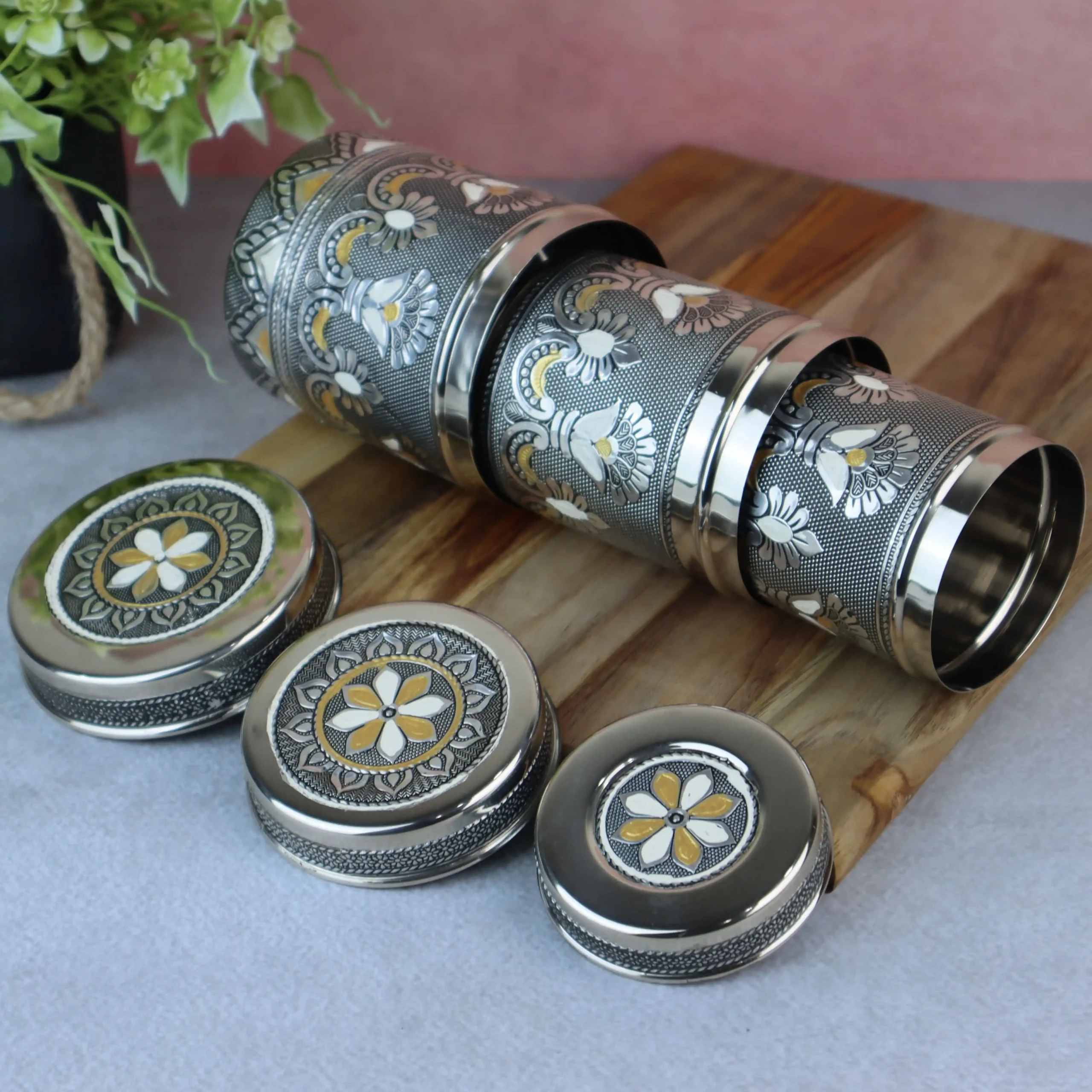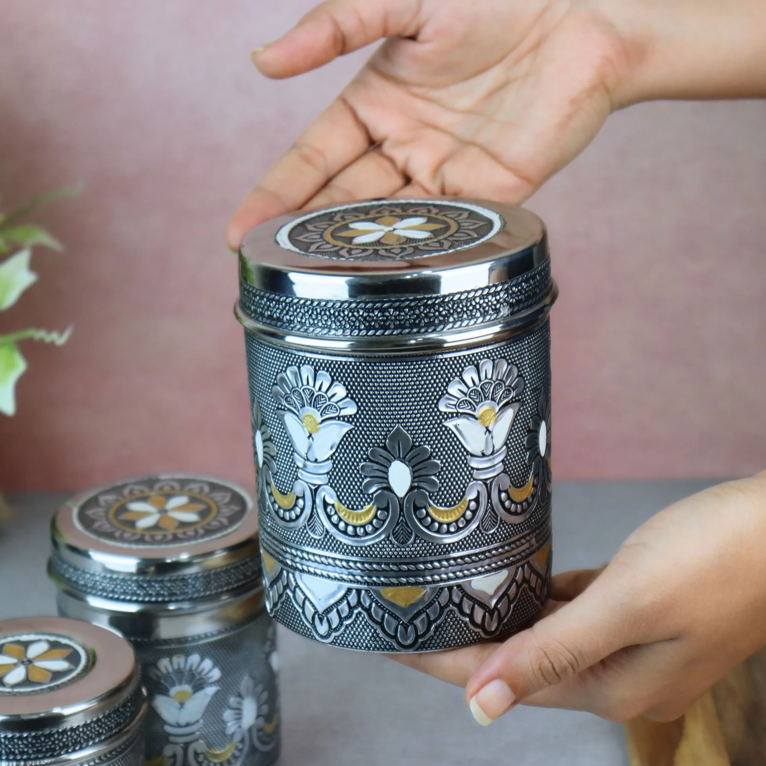 The Medium Oxidized Steel Dabba set of 3 is designed for kitchens that require balanced storage capacity for everyday essentials. Because medium-sized containers offer flexibility, this stainless steel dabba set is suitable for storing snacks, dry foods, and frequently used ingredients. Additionally, the antique embossed silver oxidized finish adds traditional character, making the containers suitable for both storage and open-shelf display.