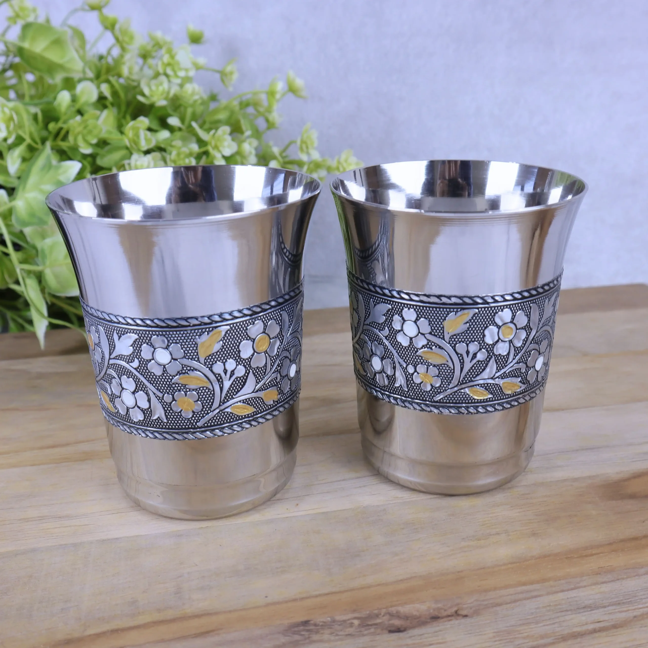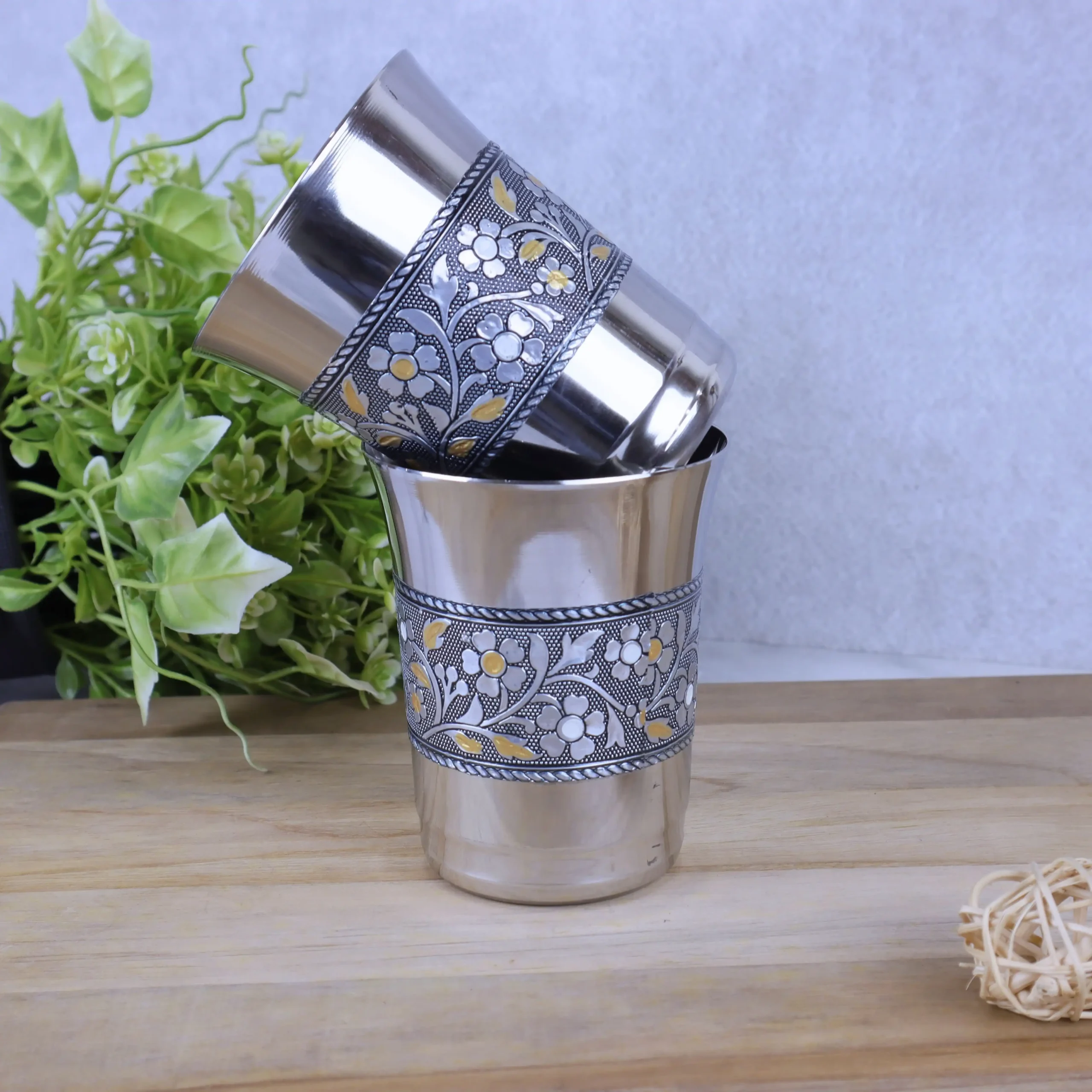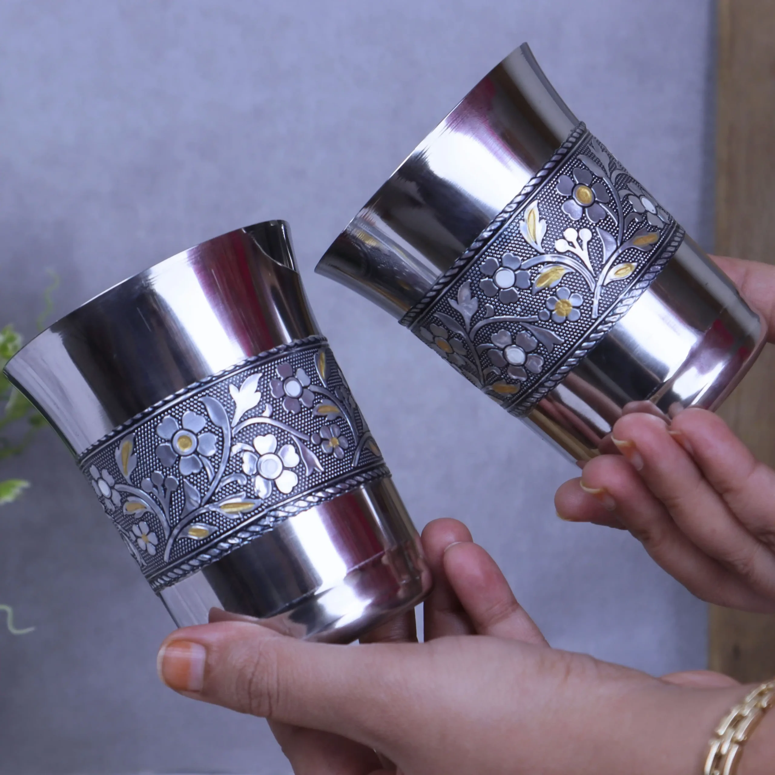 Stainless Steel Meenakari Drinking Glass Set of 2 | Silver Oxidized Decorative Glasses for Water & Beverages | Return Gift Drinkware