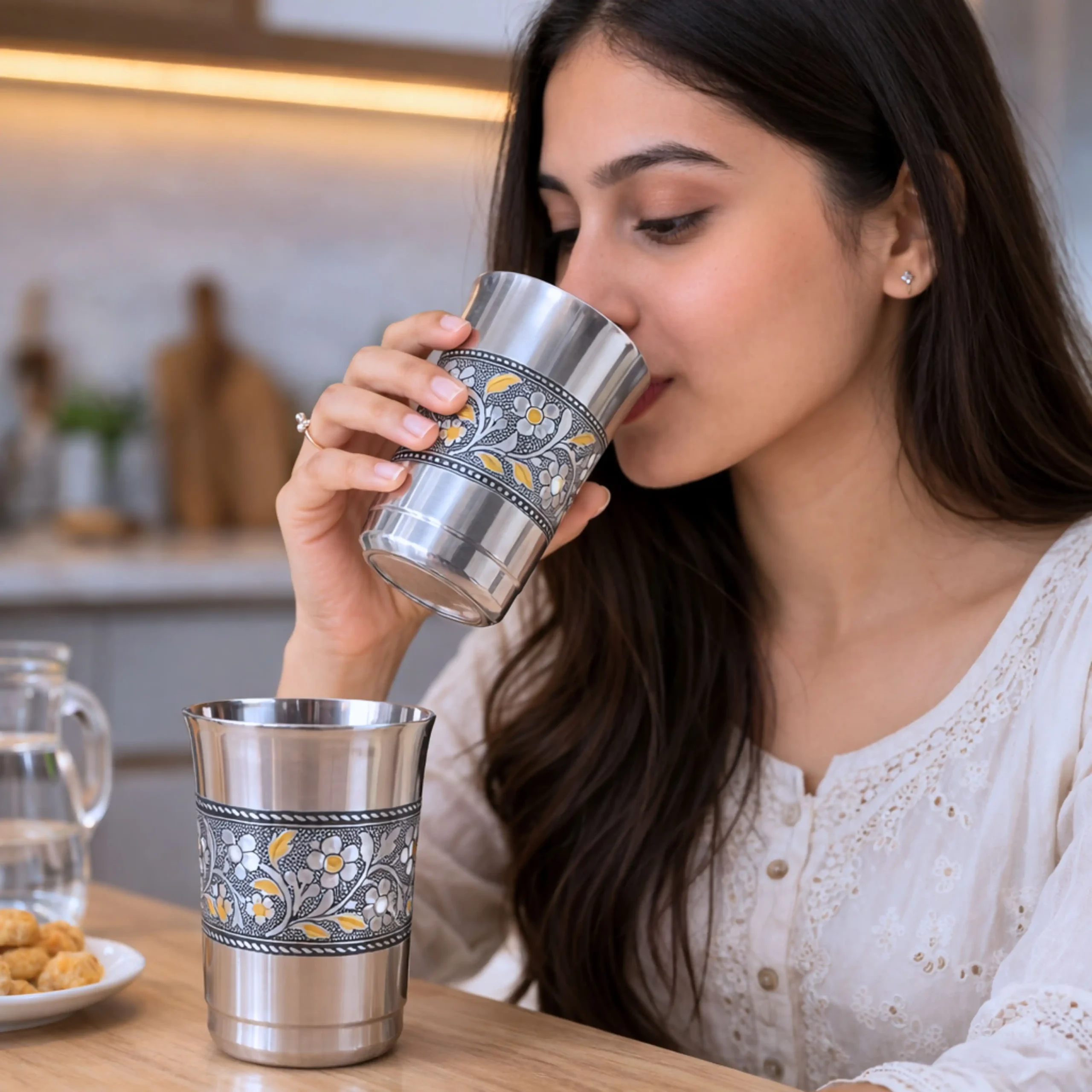 If you are looking for durable, hygienic, and traditionally styled stainless steel glasses, this oxidized Meenakari glass set is an excellent choice for home use or gifting.
